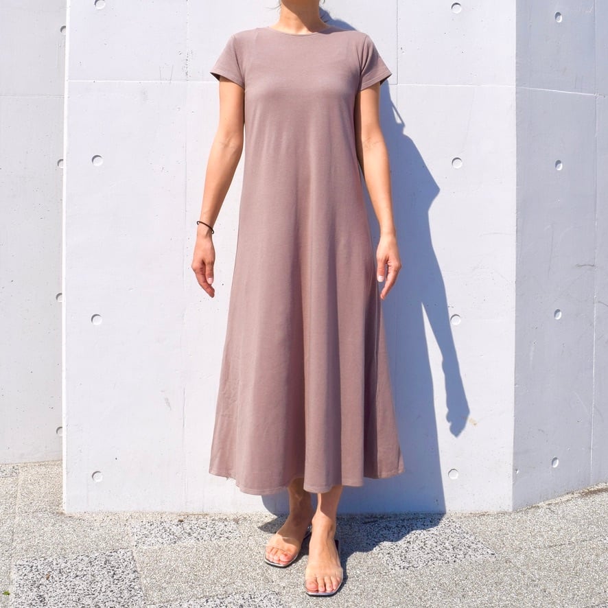 ショートスリーブで裾に向けて広がりを持つエレガントな大人のリラックスドレス。